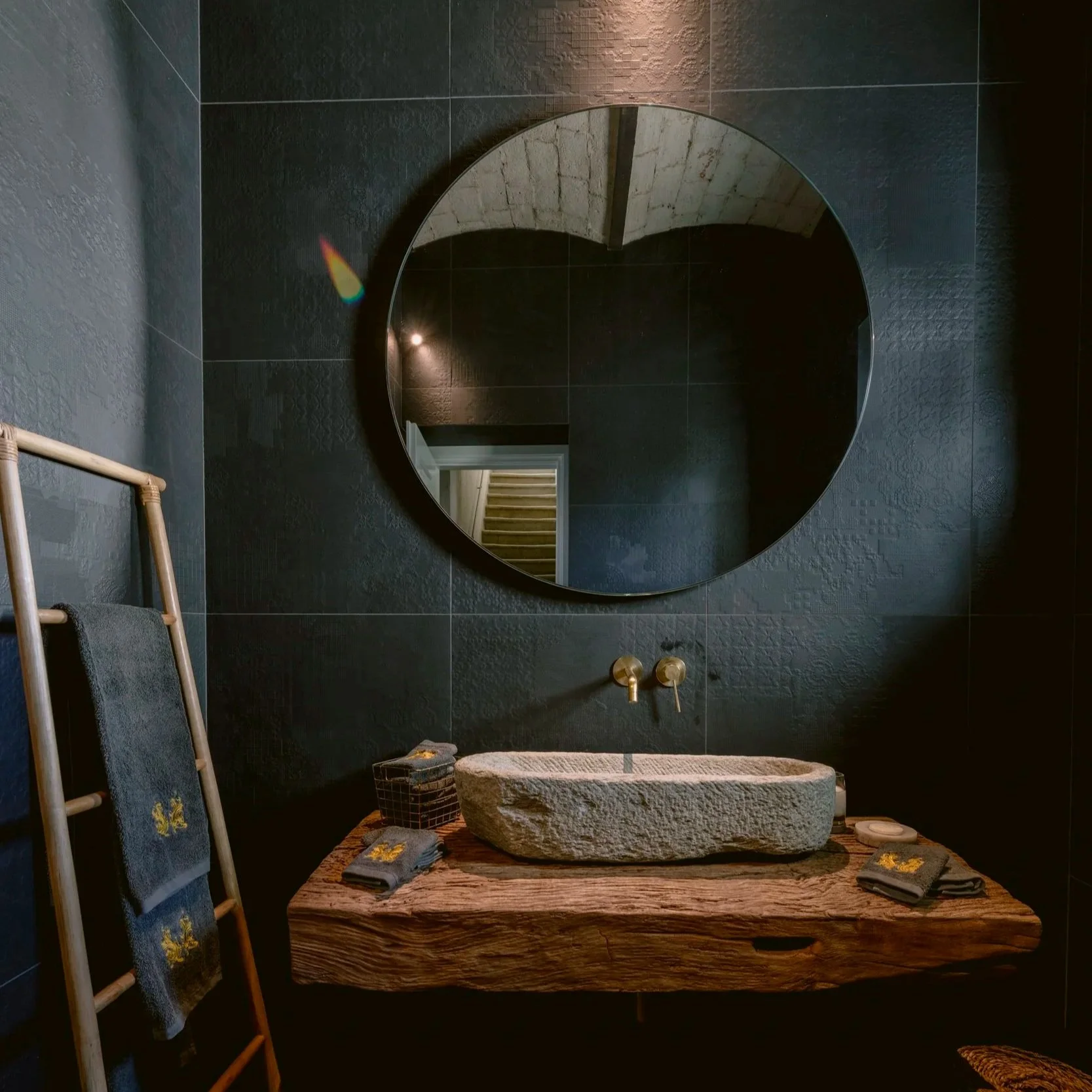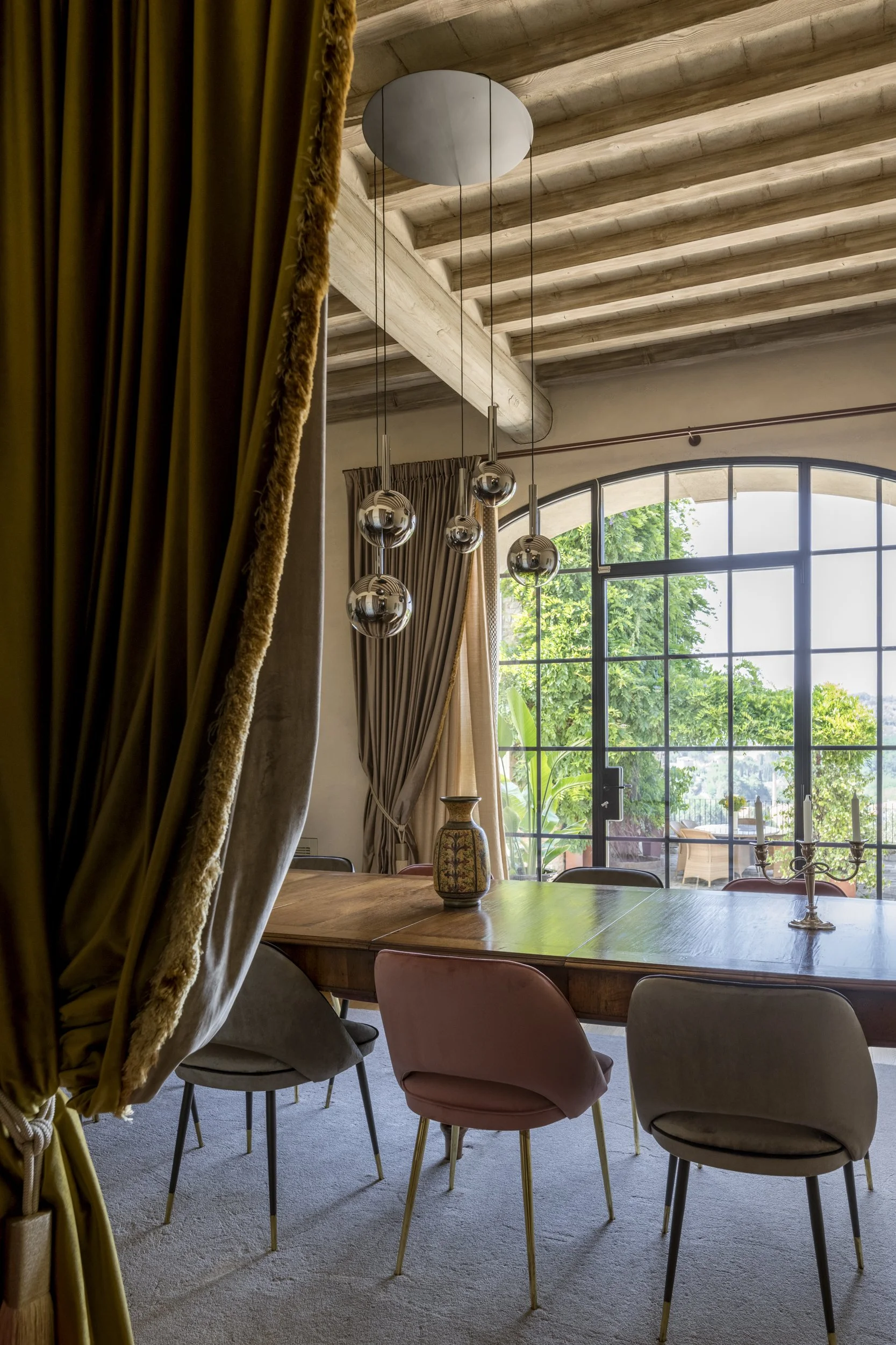 Beyond the kitchen lies the open and eclectic living space filled with life and personality and featuring designer chairs and objects, beautiful rugs, high quality furniture and antiques creatively blended together for a less conventional yet refined, playful and restful ambiance.